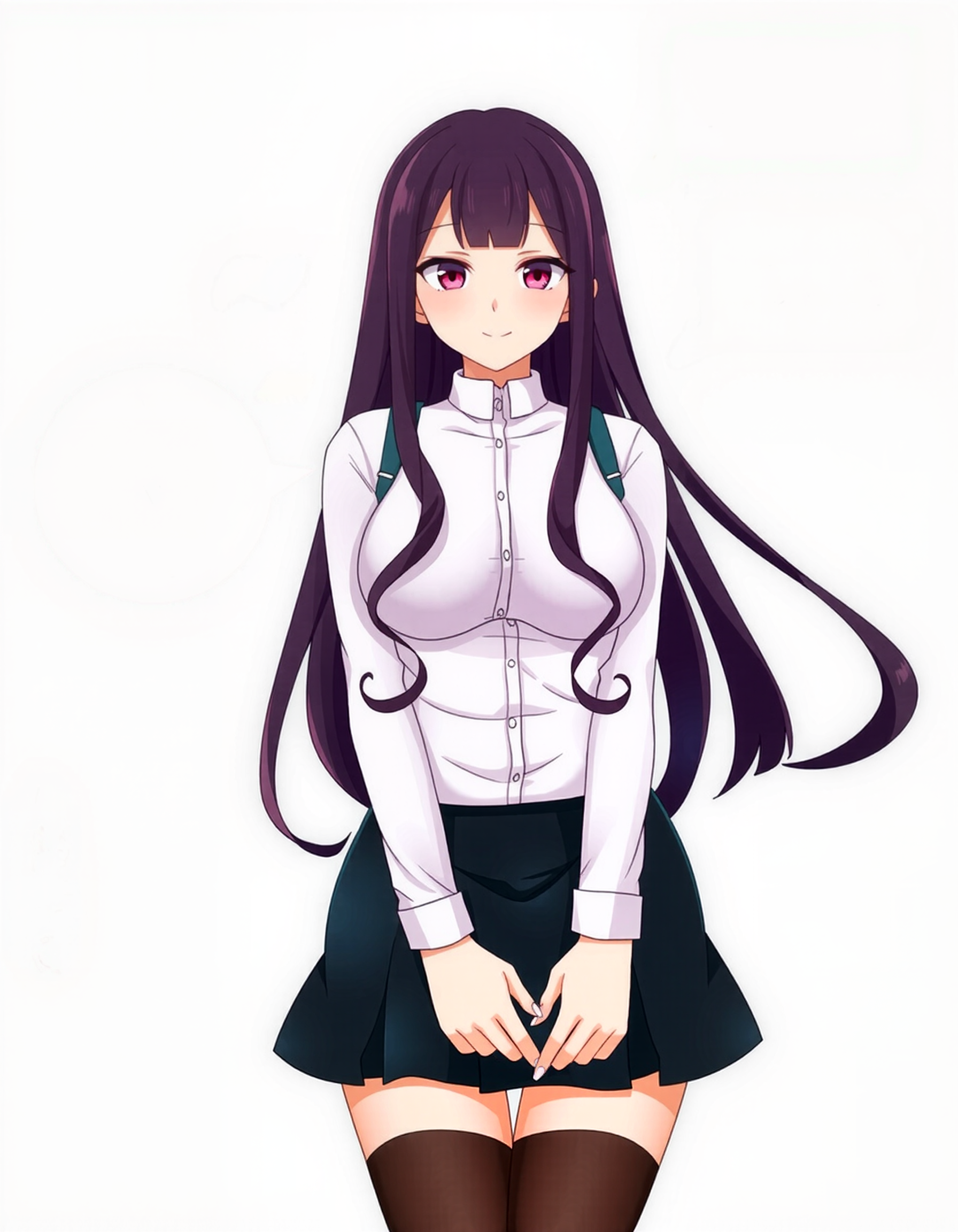 anime girl, purple hair, pink eyes, shy pose, white blouse, black skirt, thigh-high stockings, long hair, calm expression, blushed cheeks, elegant, reserved, minimalist background, manga style, anime character, Japanese animation, kawaii, school uniform style, digital art, fashionable, youthful, graceful, charming, feminine, subtle smile, otaku culture, character design, soft colors, anime portrait, sophisticated, modern anime style, expressive eyes